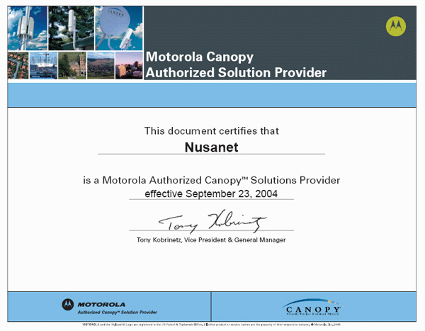 Untuk memberikan distribusi Internet (lastmile) yang reliable, Nusanet telah menjadi ‘Motorola Canopy Solution Provider’ yang pertama di Asia Tenggara sejak 2004.
